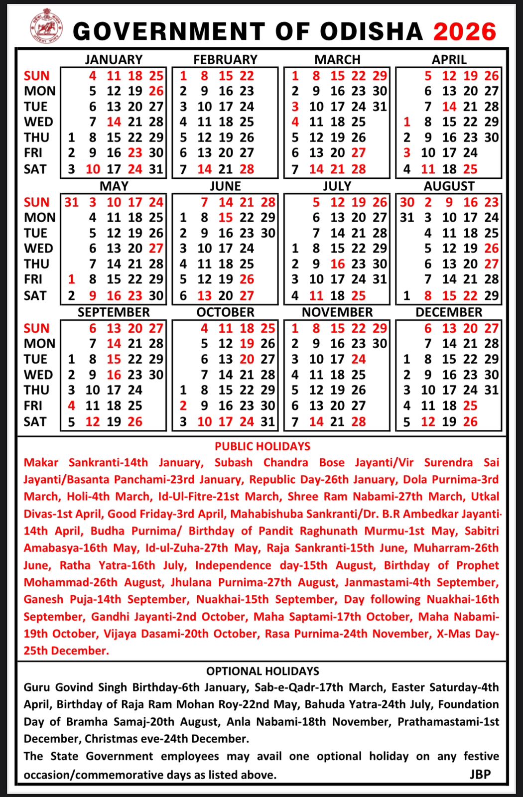 ୨୦୨୬ ସରକାରୀ କ୍ୟାଲେଣ୍ଡର : ୨୯ ଦିନ ସରକାରୀ ଛୁଟି, ୯ଦିନ ଇଚ୍ଛାଧିନ ଛୁଟି