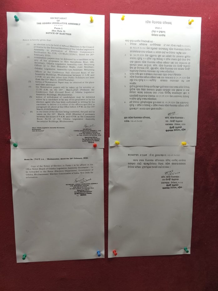 ପ୍ରକାଶ ପାଇଲା ରାଜ୍ୟସଭା ନିର୍ବାଚନ ପାଇଁ ବିଧିବଦ୍ଧ ବିଜ୍ଞପ୍ତି। ମାର୍ଚ୍ଚ ୧୬ ତାରିଖରେ ହେବ ରାଜ୍ୟସଭା ନିର୍ବାଚନ । ୧୦ ରାଜ୍ୟର ୩୭ ରାଜ୍ୟସଭା ଆସନ ପାଇଁ ନିର୍ବାଚନ ହେବାକୁ ଥିବାବେଳେ ଓଡ଼ିଶାର ୪ ଆସନ ପାଇଁ ହେବ ନିର୍ବାଚନ । ମାର୍ଚ୍ଚ ୫ ତାରିଖରେ ନାମାଙ୍କନ ଦାଖଲର ଶେଷ ତାରିଖ, ୬ ତାରିଖରେ ଯାଞ୍ଚ। । ମାର୍ଚ୍ଚ ୯ ରେ ପ୍ରାର୍ଥୀପତ୍ର ପ୍ରତ୍ୟାହାରର ଶେଷ ତାରିଖ ।ସେହିପରି ମାର୍ଚ୍ଚ ୧୬ ତାରିଖ ସକାଳ ୯ରୁ ଅପରାହ୍ଣ ୪ ଯାଏଁ ଭୋଟ୍ ଗ୍ରହଣ, ଅପରାହ୍ଣରେ ହେବ ଭୋଟ୍ ଗଣତି |